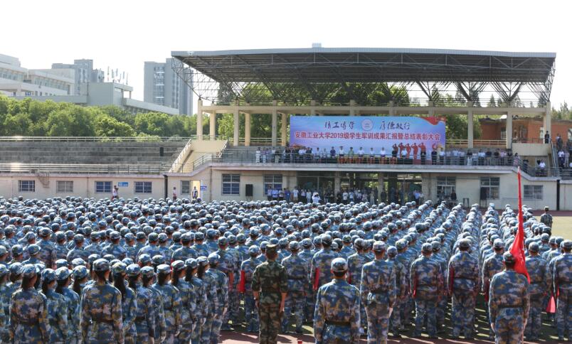 在军训成果汇报表演环节,伴随着铿锵的解放军进行曲,分列式方阵军姿齐整,迈着矫健的步伐通过主席台,接受学校领导和承训部队首长的检阅。参加特色方队训练的同学们分别展示了女生拳腿法、男生擒敌术基本动作;参加战术和战场救护训练的方队,展示了战术和火力掩护下战场救护;来自武警马鞍山市支队的承训教官做了精彩的“倒功”“一招制敌”展示。1200名参训新生组成的“祝福祖国”方队摆出“祖国万岁”“1949-2019”“I❤安工大”字样。“我和我的祖国,一刻也不能分割......”伴随着熟悉优美的旋律,全场师生齐唱《我和我的祖国》,深情表达对新中国成立70周年的祝福。