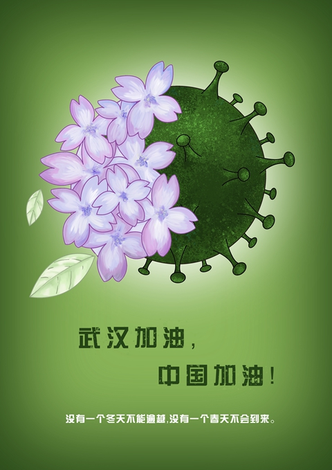 “我设计的作品是人民群众在开满鲜花的春天抗击疫情,花是美好春天的象征,相信经过全国人民齐心协力、众志成城的努力,终将在开满鲜花的春天战胜肆虐的病毒。武汉加油,中国加油!”数字媒体181班唐丽媛同学这样解释她设计的作品。她是通过学院发起的艺术生战“疫”主题设计作品征集活动设计的作品。