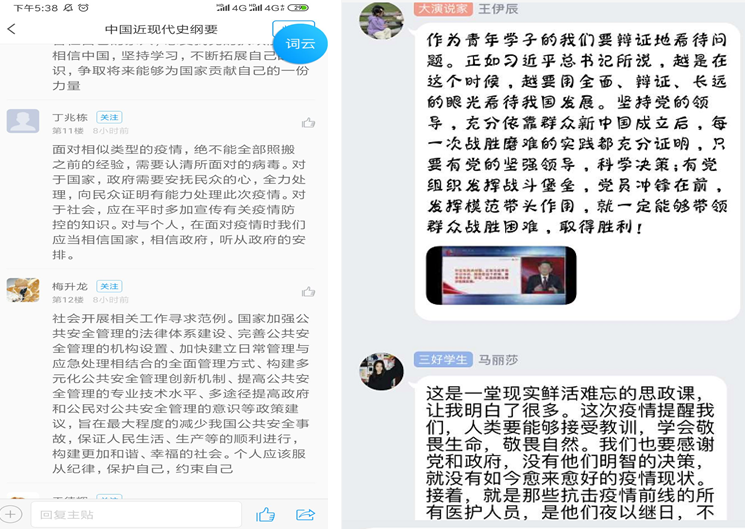 3月9日下午,校党委宣传部、教务处、马克思主义学院、学工部积极组织思政课教师、学生工作队伍、广大学生通过人民智云客户端、咪咕视频客户端、“学习大国”微信公众号、线上课堂等方式收看由教育部社会科学司、人民网联合举办“全国大学生同上一堂疫情防控思政大课”。直播结束后,各学院通过组织线上课堂讨论、班级征集学习心得、微信分享收看体会等,引导学生加深对课程内容的理解,提升思政大课收看效果。广大师生纷纷表示,从别开生面的思政大课中深刻领会到了“中国精神、中国力量、中国智慧、中国速度”所彰显的社会主义制度优越性,进一步增强了万众一心战胜疫情的信心,也更加坚定了奋发图强、努力进取,为祖国建设贡献青春力量的决心。