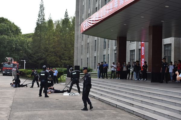 第二阶段是反恐防暴演练,模拟校园不良网贷引发暴力催债情景展开。2名不法分子携带凶器潜入校园拦截学生逼债,安保人员在巡逻过程中发现警情,立即上前制止并与暴恐分子周旋,周围学生及时拨打110报警,几分钟后公安特警接到指令到达现场进行处置,将暴恐分子当场制服并带离。参演人员的精彩表演,配以主持人的生动旁白讲解,赢得了在场师生的阵阵掌声。