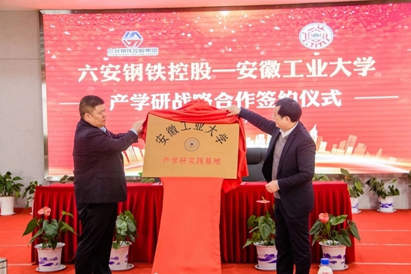 1月17日,校党委书记刘新跃、校长魏先文率队赴六安钢铁控股集团出席产学研战略合作签约仪式。副校长水恒福,党办校办、科研处、冶金工程学院等部门负责人出席了签约仪式。六安市市委常委、副市长束学龙,六安钢铁控股集团党委书记、董事长王建兵,霍邱县副县长赵德军以及六安市、霍邱县相关部门负责人参加仪式。