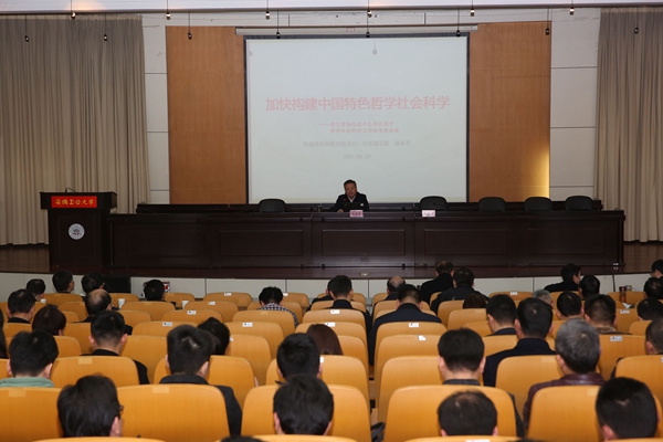 洪永平以“加快构建中国特色哲学社会科学”为题,重点解读了习近平总书记关于哲学社会科学重要论述的丰富内涵,介绍了李锦斌书记在省社科联第八次代表大会上的讲话精神,以及安徽省哲学社会科学基本情况,并从强化马克思主义指导地位、研究与解决重大理论与现实问题、打造哲学社会科学的“皖字品牌”、发挥新型智库作用等四个方面强调了如何加快打造中国特色、安徽特点的哲学社会科学。