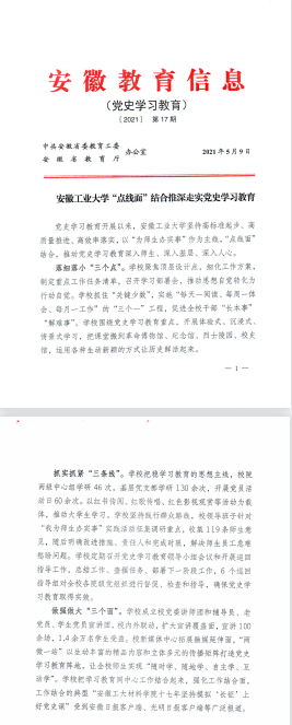 今年是建党100周年,在全党开展党史学习教育,是党中央立足党的百年历史新起点、统筹中华民族伟大复兴战略全局和世界百年未有之大变局、为动员全党全国满怀信心投身全面建设社会主义现代化国家而作出的重大决策。学校严格按照党中央、省委和省委教育工委的部署要求,高标准高质量开展好党史学习教育。5月9日,省委教育工委《安徽教育信息》首页刊登威尼斯官网“点线面”结合推深走实党史学习教育开展情况。