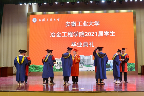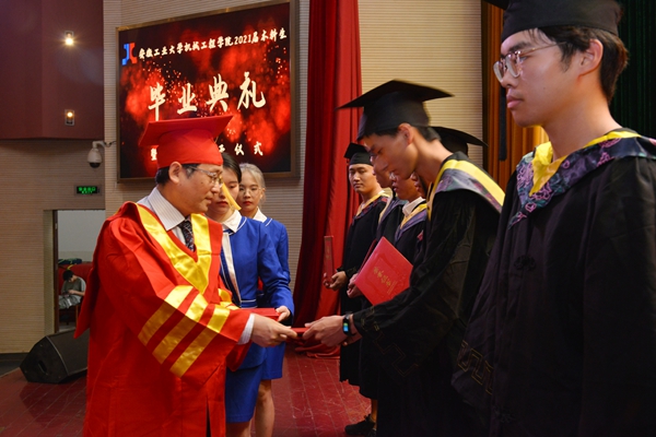 典礼上,魏先文和学院学位委员会委员代表为身着学位服的2021届毕业生扶苏正冠,行拨穗礼,颁发毕业证书、学位证书并合影留念。学生代表、教师代表、家长代表、校友代表依次发言。大会表彰了安徽省普通高等学校优秀毕业生、校优秀毕业生,聘任了2021届校友联络员。(撰稿:吴巍 张敏 张苒 审核:杨建 李克明 杜飞)