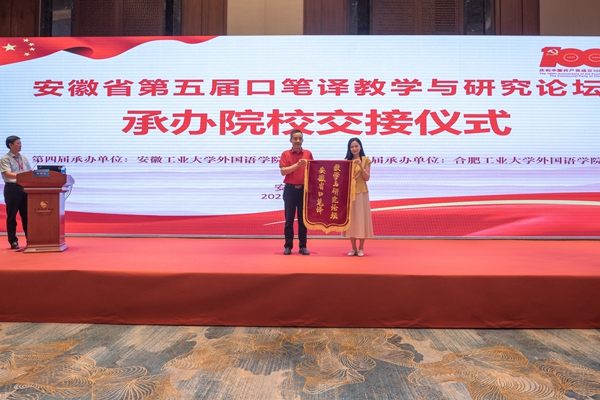 闭幕式上,外国语学院党委书记黄宇弦向下一届承办单位合肥工业大学外国语学院副院长唐军转交安徽省口笔译教学与研究论坛会旗。(撰稿:徐晓寒 陈金凤 审核:曹瑞斓 张苒 杜飞)