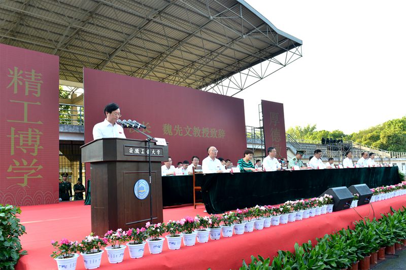 在雄壮的国歌声中,大会正式开始。魏先文在题为《德智体美劳全面发展,五育并举育时代新人》的致辞中,向广大新同学的到来表示欢迎,向辛勤培育同学们成长的父母、师长表示敬意,向各位承训教官表示感谢。他简要介绍了学校基本情况和本届新生、在校生情况,并向同学们提出了五点希望。一是希望同学们明大德、担大任,争做厚德敏行的有为者,做到以修身为先,慎独、慎初、慎微、慎欲,诚实做事、诚信做人、潜心学问,始终坚持爱国、爱党和爱社会主义相统一,立志听党话、跟党走,将自己的理想同祖国的前途、自己的人生与民族的命运紧密联系在一起,立志肩负起民族复兴的时代重任。二是希望同学们长智慧、成大才,争做精工博学的奋进者,树立终身学习理念,把学习当作精神追求、生活习惯和社会责任,养成善于学习、勤于思考的习惯,实现学以养德、学以增智、学以致用。三是希望同学们常锻炼、增体质,争做身心健康的搏击者,走下网络、走出宿舍、走向操场,做到“每天锻炼一小时,健康工作五十年,幸福生活一辈子”。四是希望同学们发现美、践行美,争做品位高雅的创造者,积极参与到学校各类校园文化活动中,努力提高自身艺术修养,用美来陶冶心灵,焕发高尚的道德情操,真正成为一个高尚的、丰盈的、全面发展的人,让人生得到诗意的绽放。五是希望同学们爱劳动、乐生活,争做自强不息的实践者,在学习和生活中上好劳动教育这门必修课,勇于探索,敢于创新,追求卓越。