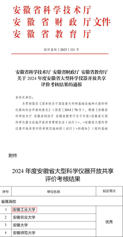 近日,安徽省科学技术厅、安徽省财政厅、安徽省教育厅联合发布2024年度安徽省大型科学仪器开放共享评价考核结果,威尼斯官网获评“优秀”等次。