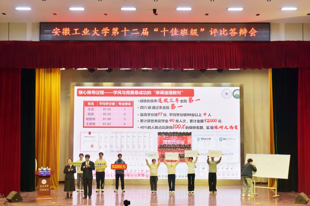 综合前期线上投票、班级创建展示和现场答辩情况,计算机科学与技术学院智能Y221班、化学与化工学院化221班、建筑工程学院筑212班、材料科学与工程学院料222班、电气与信息工程学院自224班、商学院融221班、微电子与数据科学学院数B221班、管理科学与工程学院工231班、公共管理与法学院法221班、能源与环境学院环221班获评第十二届“十佳班级”。(撰稿:孔志强 审核:王萌 赵龙 张苒 黄敏)