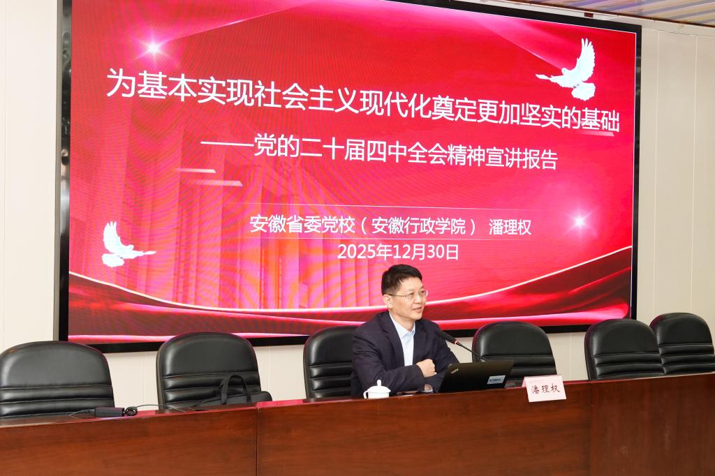 潘理权围绕“为基本实现社会主义现代化奠定更加坚实的基础”主题,全面回顾“十四五”时期我国发展取得的重大成就,对标对表阐述“十四五”规划完成情况,聚焦我国以及安徽省在经济、科技、对外开放、民生保障、生态环境等方面的突出进展;深入分析“十五五”时期我国发展面临的国际国内环境、新的战略机遇和风险挑战,阐释新发展阶段、新发展理念、新发展格局的深刻内涵;围绕全会关于“十五五”时期经济社会发展的重要部署,系统解读指导思想、重大原则、主要目标、战略任务和重大举措、根本保证。
