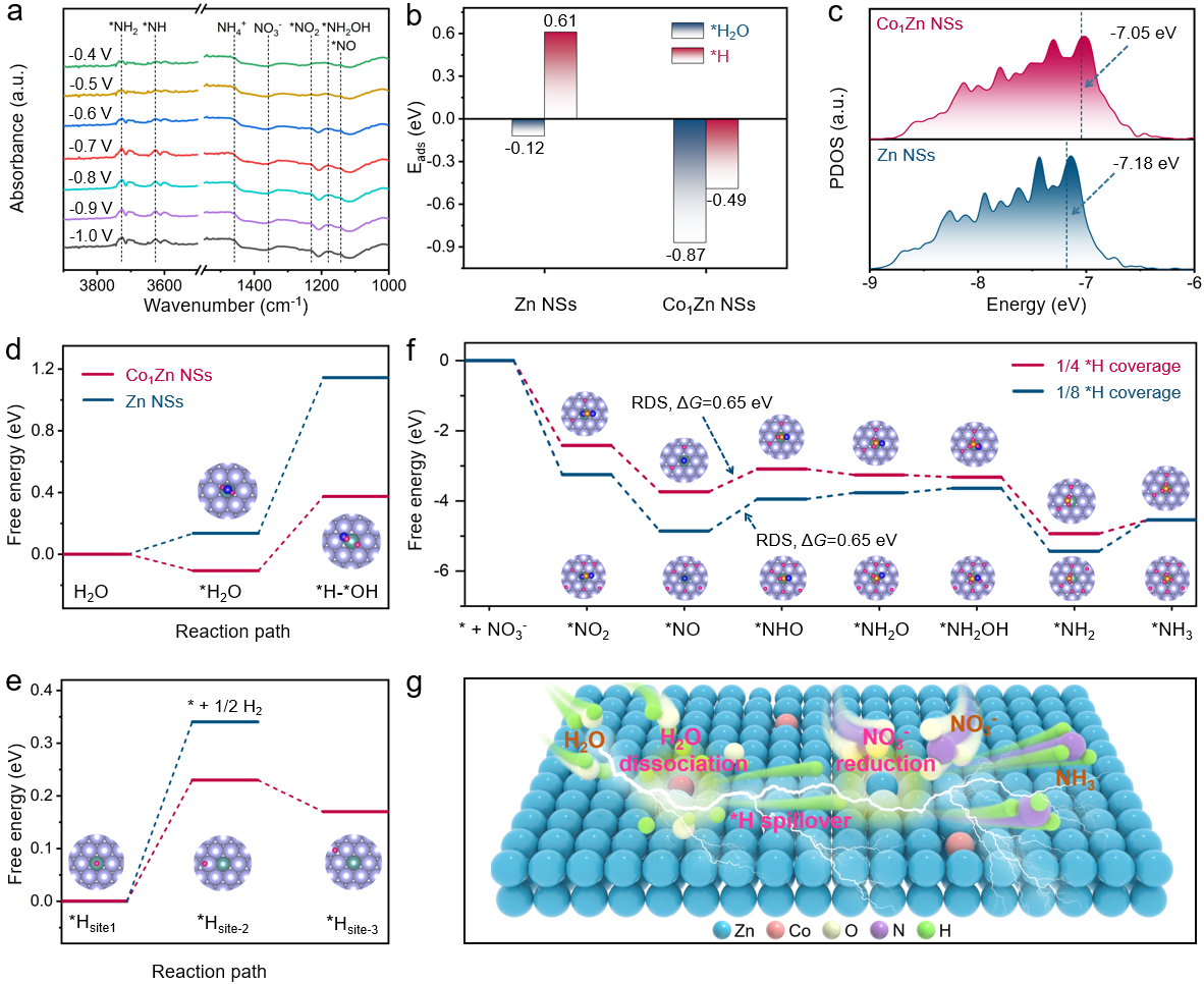 为了解决这一难题,团队通过精巧的单原子合金设计,开发了一种Co1Zn非贵金属氢溢流体系,成功解决了电催化硝酸盐还原合成氨反应中活性氢的供应难题。凭借该催化体系中显著的氢溢流效应,在安培级电流密度下实现了硝酸盐到氨的高效催化转化。在流动电解池中,实现了高达2.4 A cm⁻2的合成氨反应电流密度和204.5 mg h⁻1 cm⁻2的产氨速率,性能远超未形成氢溢流效应的Zn纳米片催化剂。此外,基于该催化剂组装的Zn-NO3⁻可充电电池展现出优异性能,可以稳定的输出1.39 V的电压和5.51 mW cm-2的峰值功率密度。本研究揭示了非金属合金体系中氢溢流机制的可行性,为电催化氢化反应的催化剂设计提供了新思路。(撰稿:刘明凯 审核:韩新亚 张苒 黄敏)