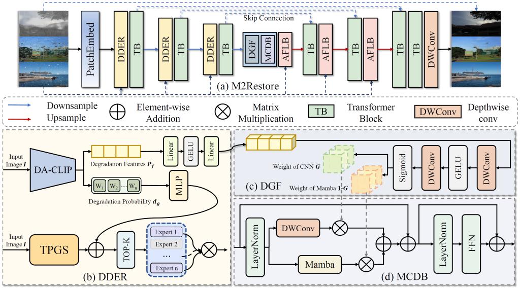 构建通用新框架,实现“一体化”图像恢复。面对噪声、模糊、雨、雾等复杂多变的混合退化场景时泛化能力不足;难以在保持局部精细纹理与建模全局语义依赖之间取得平衡两大核心瓶颈,团队提出一种全新的M2Restore框架。其核心创新在于构建了一个动态智能的“混合专家”系统,通过引入预训练的CLIP视觉语义先验,结合可学习的任务提示,使模型能够自主识别图像中不同的退化类型与区域,从而动态调度最合适的专家网络进行处理,实现了单一模型对多种未知或复合退化的自适应精准复原。此外,针对全局建模与局部细节的平衡难题,团队没有采用常规的模块堆叠方式,而是提出了Mamba-CNN双分支协同架构。该架构让擅长全局依赖建模的Mamba与专注局部特征提取的CNN并行工作,通过一个边缘感知的动态融合门控机制,自适应地融合两者优势,即在平滑区域采用Mamba模块进行全局一致性修复,而在纹理边缘区域则利用CNN强化细节信息。实验结果表明,M2Restore在多种复杂退化场景下均取得了领先的复原性能,其提出的动态专家路由与全局—局部协同机制,为通用视觉复原模型的发展提供了重要思路。相关成果发表在图像处理领域顶级期刊《IEEE Transactions on Image Processing》,王永振博士为论文第一作者,本科生李勇俊为第二作者。