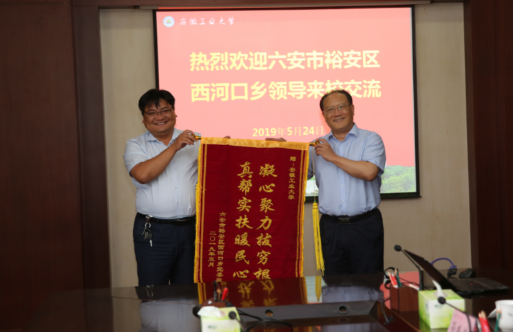 5月24日下午,六安市裕安区西河口乡乡长汪明家一行4人来校交流扶贫工作。校党委书记刘新跃、副书记祖明出席座谈会,校办、工会、冶金学院、材料学院、资产处、驻村工作队等部门单位负责人参加了座谈交流。在校期间,校长魏先文接见了汪明家一行。