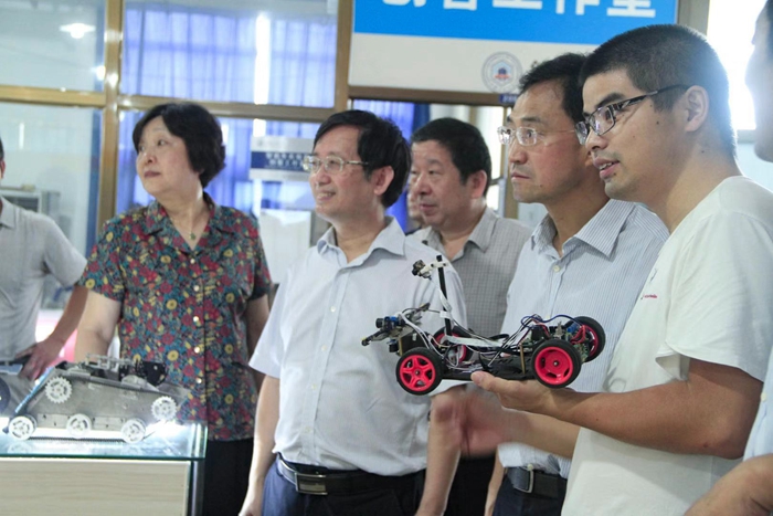 在创客工作坊,刘明波看望了正在备战全国大学生电子设计大赛安徽省赛的同学们,饶有兴致地观看了无碳小车模拟训练和叉架式立体停车场等的演示,了解其中的工作原理和应用前景,并鼓励学生们下苦功夫,坚持到底,争创佳绩。当看到学校围绕大学生创新能力开发,在课程建设、教材建设等方面进行了一系列改革探索后,他颌首称赞,并勉励学校深化落实全国全省教育大会精神和“三起来一出去”教育教学改革,培养出更多具有社会责任感、创新精神和实践能力的社会主义建设者和接班人。