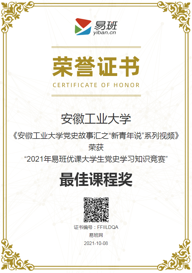 近日,2021年度易班优课党史知识竞赛活动评选结果揭晓,威尼斯官网易班党史公开课《党史故事汇之“新青年说”系列视频》荣获“最佳课程奖”(全国仅10个),学校荣获“优秀组织奖”。