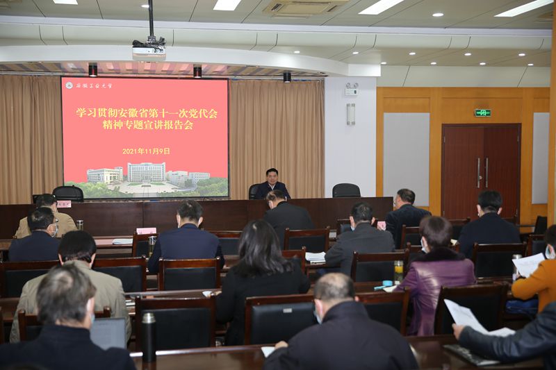 11月9日下午,学校在佳山校区会议中心二楼报告厅举办学习贯彻安徽省第十一次党代会精神专题宣讲报告会,省第十一次党代会代表、校党委常委、副校长王先柱作学习贯彻省第十一次党代会精神宣讲报告,校党委常委、纪委书记、监察专员潘淑琴传达学习中共安徽省第十届纪律检查委员会工作报告。校党委书记陆林主持会议并讲话。