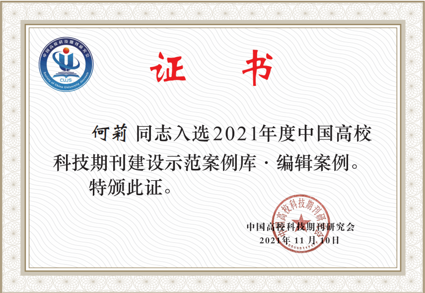 近日,中国高校科技期刊研究会第25次学术年会顺利召开,大会公布了“2021年度中国高校科技期刊建设示范案例库•编辑团队及编辑个人案例”入选结果。威尼斯官网学报编辑部教师何莉提交的编辑案例成功入选“2021年度中国高校科技期刊建设示范案例库·编辑案例”。