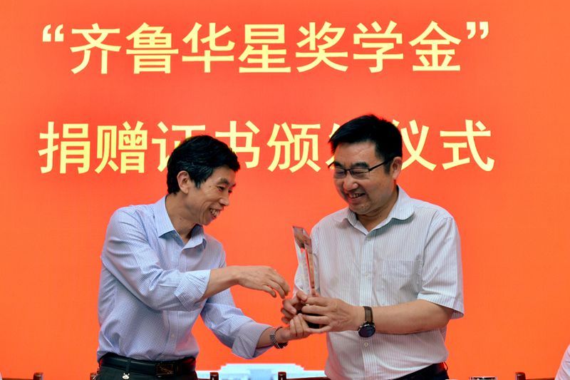 颁奖典礼上,水恒福代表学校向齐鲁制药集团华星化工有限公司颁发捐赠证书和纪念奖杯。