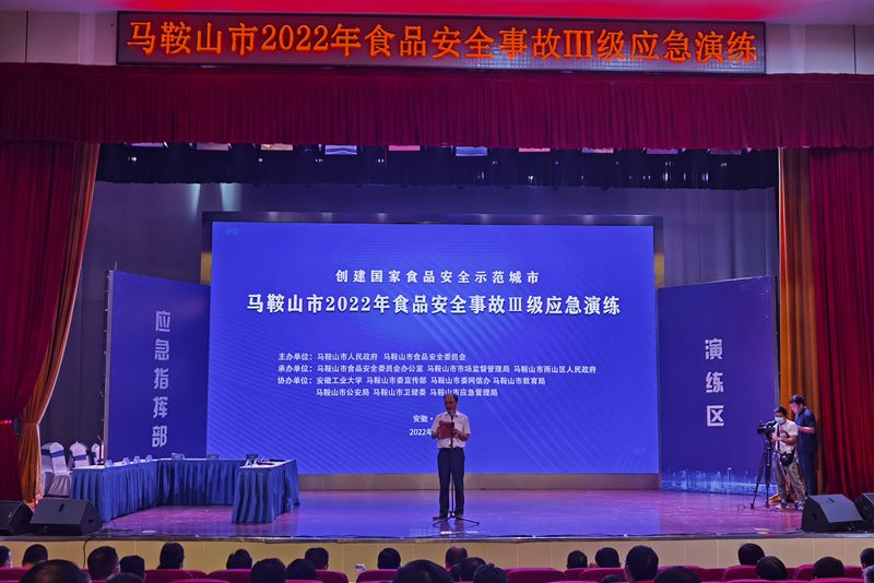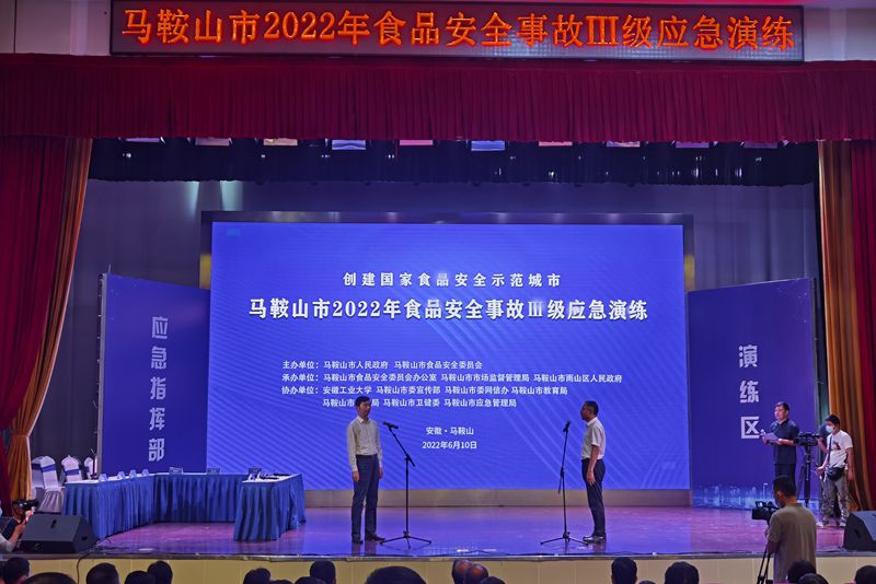 为进一步完善全市食品安全事故应急管理机制,提高各级政府和食品安全监管部门应对食品安全突发事件的高效处置能力,6月10日上午,2022年马鞍山市食品安全事故Ⅲ级应急演练在秀山校区新大学生活动中心举行。副校长刘明、马鞍山市人民政府副市长夏迎锋出席,马鞍山市食品安全委员会成员单位、威尼斯官网学工部、安保部、后勤处负责人以及师生代表100余人现场观摩。