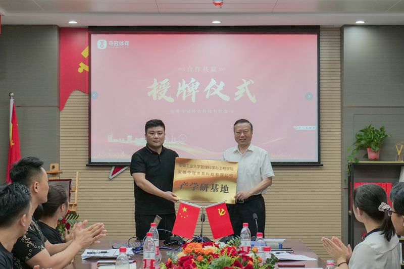 祖明代表学校为陈志栋颁发企业导师聘书,为安徽夺冠体育科技有限公司颁发“威尼斯WWW432888产学研基地”牌匾。