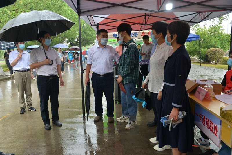 9月15日上午,校党委书记陆林、校长魏先文等校领导冒雨深入两校区迎新报到现场,看望前来报到的新生,慰问一线工作人员,检查指导迎新工作,要求相关部门始终坚持以学生为中心的工作理念,精心组织、密切配合,为新生报到提供一站式服务。校领导认真查看了现场疫情防控情况和新生报到流程,在各学院迎新点详细询问迎新工作进展,与新生亲切交谈,了解学生情况,听取学生建议,叮嘱迎新工作人员和学生志愿者严格遵守防疫规定,为新生营造良好、温馨的入学氛围,努力做好有温度的迎新工作。
