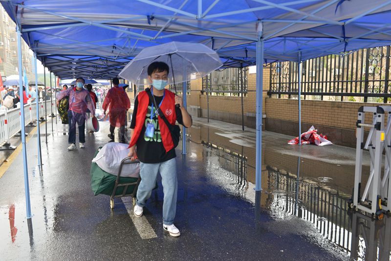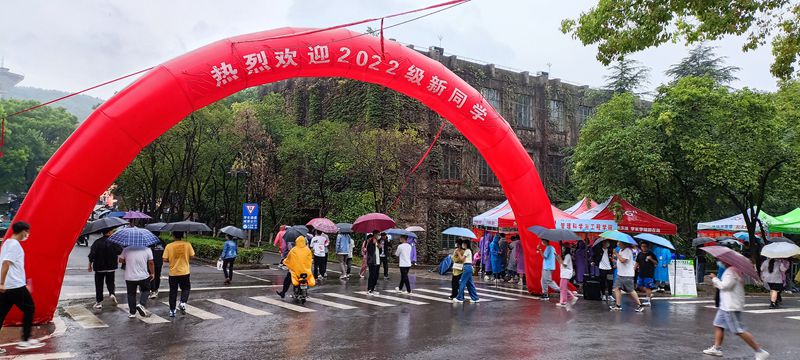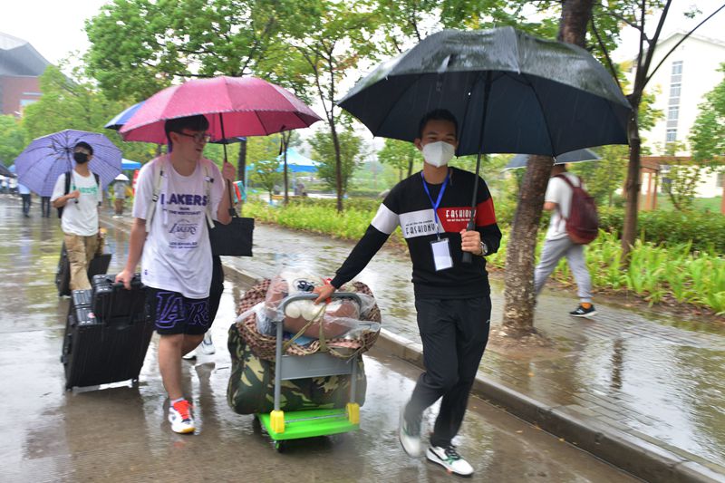 迎新报到当天,连绵的秋雨为迎新工作增加了不少难度,但是校园内处处洋溢着温暖的气息。新生入校时,严格落实健康防疫码查验、体温检测、行李物品消杀、身份查验等环节。在报到现场,各具特色的创意设计和细致科学的迎新措施,展示了各学院独特的创意思维和昂扬向上的精神风貌,迎新工作人员和学生志愿者引导并协助新同学办理报到手续,帮助新生搬运行李,为新生答疑解惑,以饱满的热情、周到的服务让学生感受到来自学校的人文关怀。