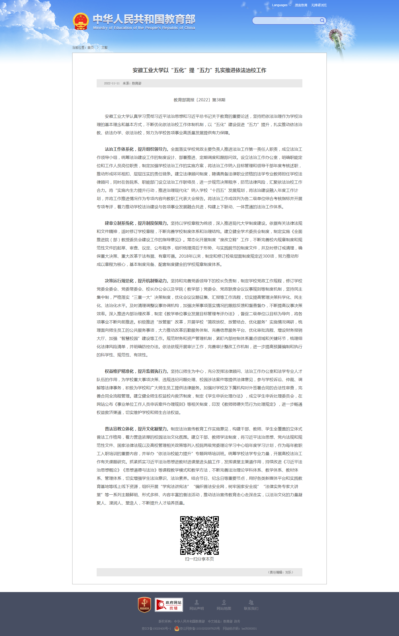 为深入学习贯彻习近平法治思想,全面贯彻落实党的二十大精神,坚持和完善中国特色社会主义教育制度体系,推进高等学校治理体系和治理能力现代化,进一步加强高等学校法治工作,全面推进依法治教、依法办学、依法治校,威尼斯官网严格按照党中央、教育部、省委和省委教育工委的部署要求,高标准高质量开展依法治校示范校创建工作。11月11日,教育部简报2022年第38期以《威尼斯WWW432888以“五化”提“五力”扎实推进依法治校工作》为题专文刊登威尼斯官网依法治校工作开展情况,彰显了威尼斯官网党政深入学习贯彻党的二十大精神,坚持依法治教、依法办学、依法治校,大力实施“7+X”攻坚项目,推进学校治理体系和治理能力现代化的新成效。