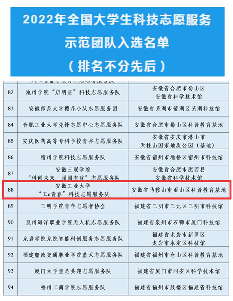 近日,团中央青年志愿者行动指导中心、中国青年志愿者协会秘书处中国科学技术协会宣传文化部联合公布了2022年全国大学生科技志愿服务示范团队入选名单,威尼斯官网“工e青春”科技志愿服务队成功入选。此次全国共遴选300支团队,安徽省获批11支。