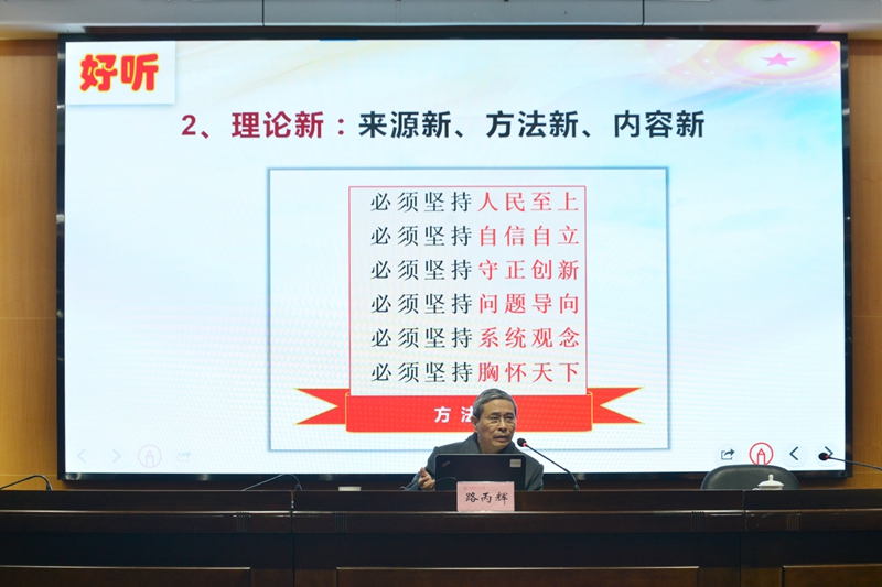 路丙辉指出,党的二十大报告“好看”在于结构紧密、逻辑严密、文字缜密,有鼓舞人心、催人奋进之感;党的二十大报告“好听”在于总结实、理论新、擘画全,有说理透彻、引人入胜的特点;党的二十大报告“好学”在于整体把握、重点突出、联系实际,起到了夯底气、长志气、添骨气、聚人气的效果。十年来,我们经历了对党和人民事业具有重大现实意义和深远历史意义的三件大事,迎来中国共产党成立一百周年、中国特色社会主义进入新时代、完成脱贫攻坚、全面建成小康社会的历史任务、实现第一个百年奋斗目标。党的二十大从16个方面对新时代党和国家事业取得历史性成就、发生历史性变革进行了全面总结和精辟概括,经济快速发展、社会长期稳定,中华民族伟大复兴进入不可逆转的历史进程。党的二十大把“十个明确”、“十四个坚持”、“十三个方面成就”概括为习近平新时代中国特色社会主义思想的主要内容,明确提出坚持人民至上、坚持自信自立、坚持守正创新、坚持问题导向、坚持系统观念、坚持胸怀天下为贯穿习近平新时代中国特色社会主义思想的世界观和方法论。习近平新时代中国特色社会主义思想实现了马克思主义中国化时代化新的飞跃,把马克思主义基本原理同中国具体实际相结合同中华优秀传统文化相结合,开辟了马克思主义中国化时代化新境界。党的二十大擘画了以中国式现代化全面推进中华民族伟大复兴的宏伟蓝图,明确了全面建成社会主义现代化强国“两步走”的战略安排,阐述了前进道路上必须牢牢把握的重大原则,从十二个方面对全面建设社会主义现代化国家进行部署。高质量发展作为全面建设社会主义现代化国家的首要任务,实施科教兴国战略、强化现代化建设人才支撑作为第二位重要任务,维护国家安全和社会稳定作为单列的重要任务。