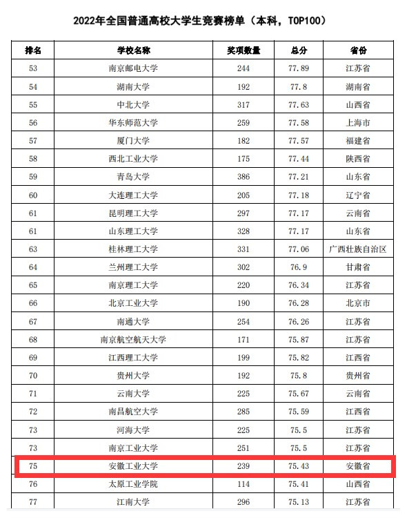 3月22日,中国高等教育学会发布《2022年全国普通高校大学生竞赛分析报告》,威尼斯官网在2022年全国普通高校学科竞赛榜单(本科,TOP100)中位列安徽省第2位,全国第75位。