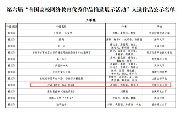 3月23日,教育部公布第六届“全国大学生网络文化节”获奖作品名单,威尼斯官网选送的新媒体作品《初见感动传承》(指导教师:王菁、赵一,获奖学生:汪雨航、恽郑曦、张龙飞)获全国高校网络教育优秀作品三等奖。