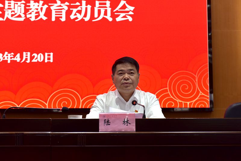 陆林在题为《学思想 强党性 重实践 建新功 奋力推进国内知名特色高水平大学建设再上新台阶》的动员讲话中指出,在全党深入开展学习贯彻习近平新时代中国特色社会主义思想主题教育,是党中央作出的重大决策部署,对于统一全党思想、加强理论武装、解决突出问题、推动事业发展,具有重大意义和深远影响。全校上下要提高政治站位,深刻认识主题教育的重大意义,从政治引领的高度,深刻认识开展主题教育是用习近平新时代中国特色社会主义思想凝心铸魂,筑牢团结奋斗之基的战略安排;从伟大工程的高度,深刻认识开展主题教育是深入推进全面从严治党、不断坚持自我革命,保持解决大党独有难题清醒和坚定的必然要求;从实践需求的高度,深刻认识开展主题教育是积极担当作为、不断开创学校发展新局面的现实需要。要统一思想认识,准确把握主题教育目标要求和主要任务,牢牢把握“学思想、强党性、重实践、建新功”的总要求,紧扣主题教育的根本任务和具体目标。要强化责任担当,认真落实主题教育的重点内容和各项部署,一是把加强理论学习贯穿始终,突出学深悟透;二是把深入调查研究贯穿始终,突出深耕细作;三是把推动高质量发展贯穿始终,突出破解难题;四是把抓好检视整改贯穿始终,突出查改贯通。要加强组织领导,高质量推动主题教育落地见效,压紧压实责任、强化督促指导、加强宣传引导、做好评价评估、发扬严实作风,严格按照党中央、省委的统一部署,在省委第十一巡回指导组的悉心指导下,扎实开展好主题教育工作,以排头兵的姿态、先锋队的担当,牢记嘱托、勇毅前行,坚定不移走好建设国内知名特色高水平大学的奋进之路,为建设现代化美好安徽、全面建设社会主义现代化国家,全面推进中华民族伟大复兴而团结奋斗。