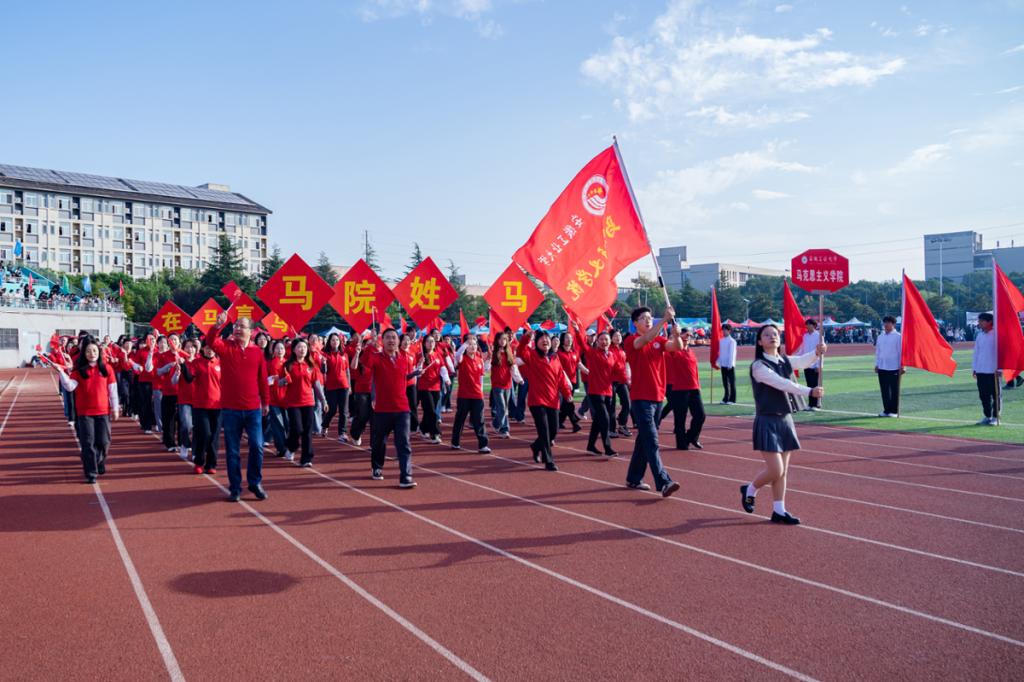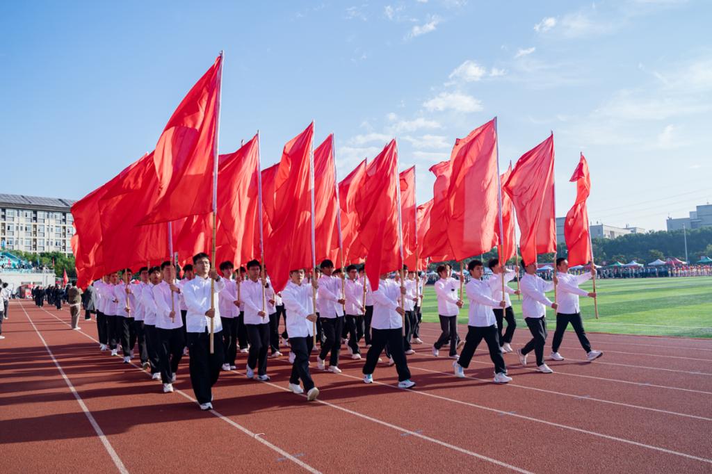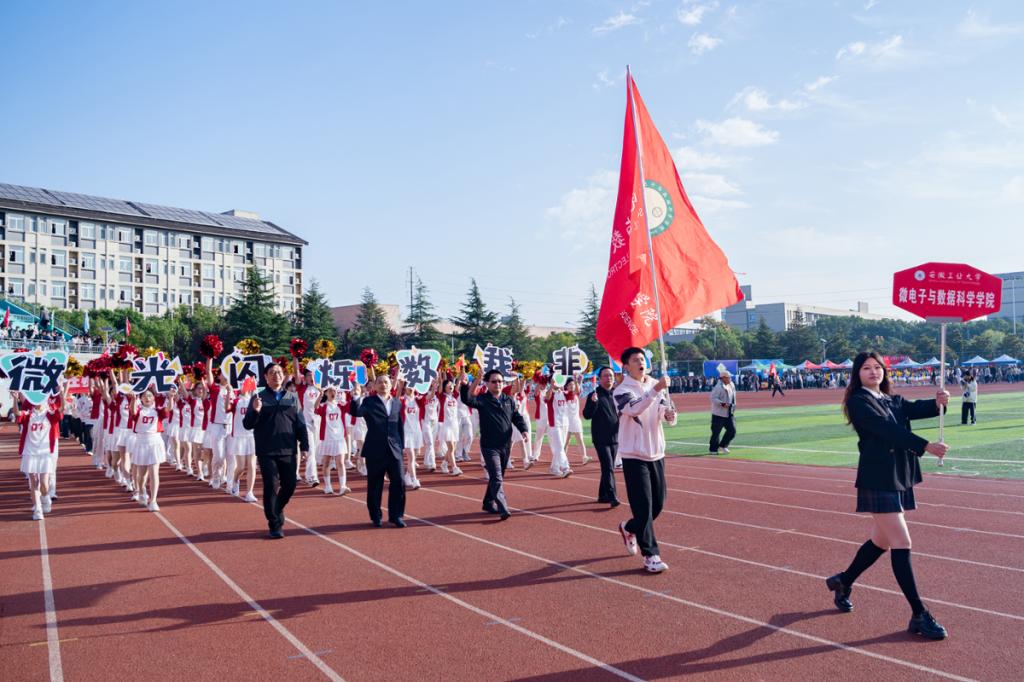 上午8时,伴随着雄壮激昂的《运动员进行曲》,校旗护旗手们迈着矫健的步伐,拥着鲜艳的校旗走向主席台,紧随其后的是由电气与信息工程学院48名同学组成的红旗方阵和体育部教师组成的裁判员方阵。教职工运动员和学生代表队按照既定的顺序依次入场。