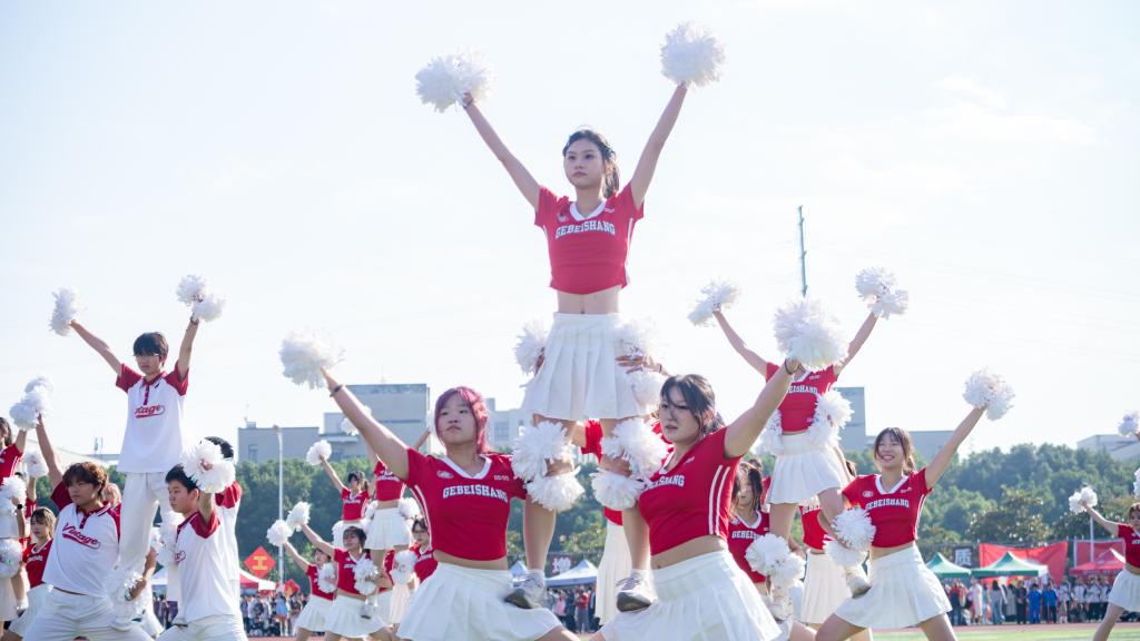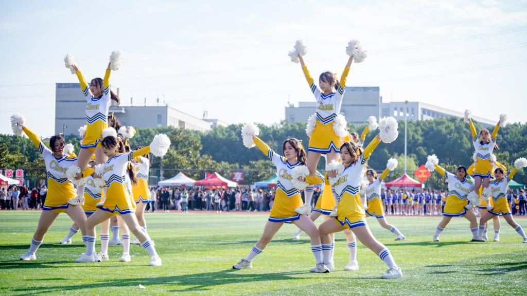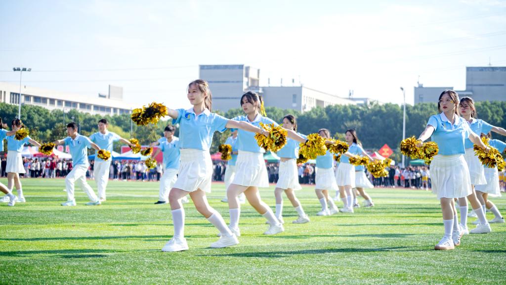 开幕式上,14个学院840名同学参加大型团体啦啦操《红日》表演。