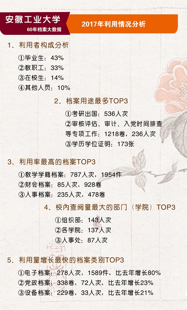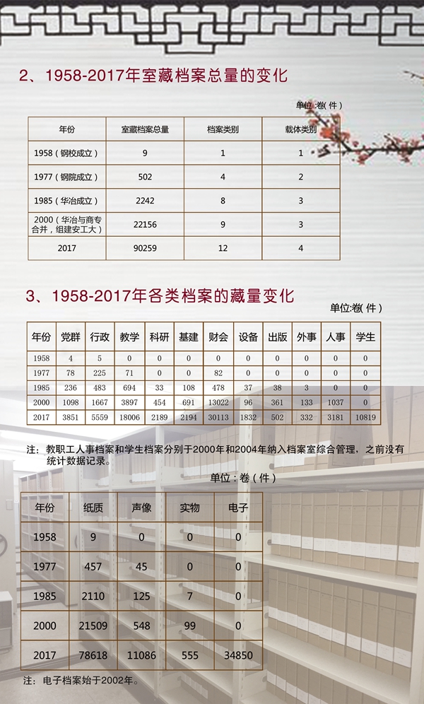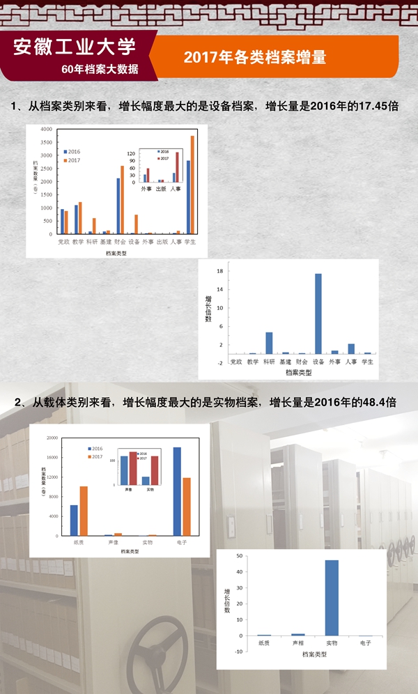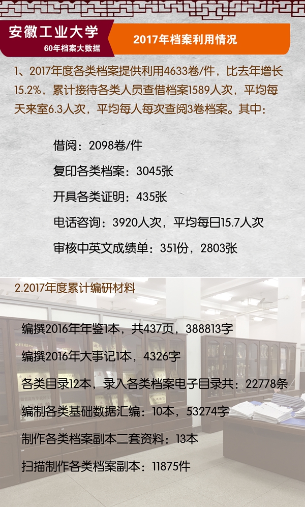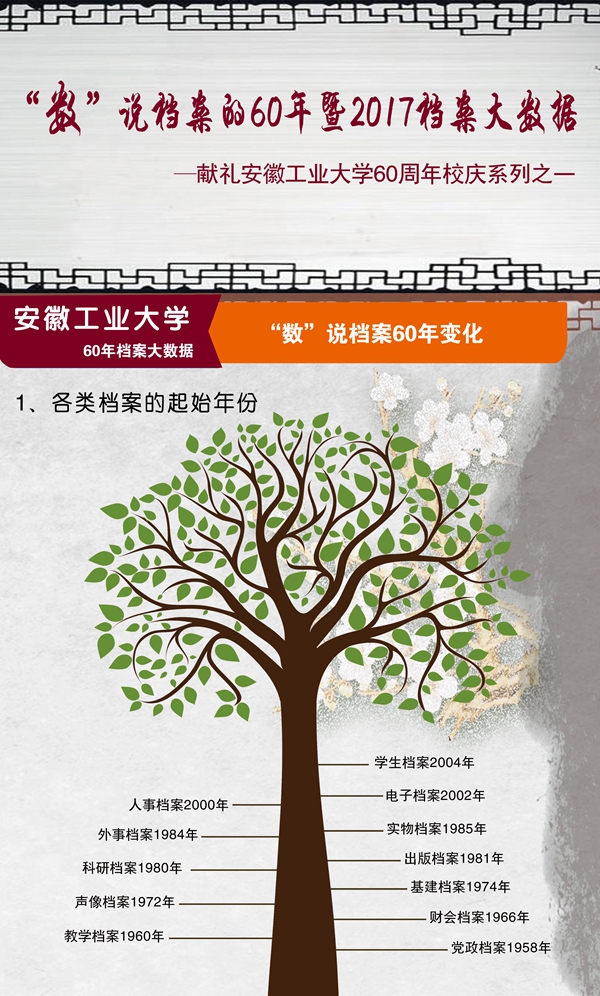 今年,我们将迎来建校60周年,威尼斯官网的档案见证了学校一步步地成长。校办档案室综合对比了60年来档案总量、各类档案数量的变化,以钢校建立、钢院建立、华冶建立、安工大组建等时间为节点,制作了直观图表,同时发布了2017年档案室藏总量、分类藏量、年度增量、利用量以利用情况分析等数据。为大家呈现出学校档案种类越来越多、档案藏量越来越丰富、档案利用越来越广泛的变化过程。
