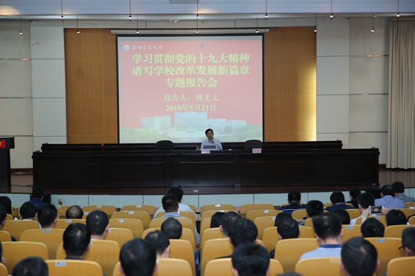 魏先文以《学习贯彻党的十九大精神,谱写学校改革发展新篇章》为题,围绕“怎么看”、“怎么办”两个维度,分析了新时代我国高等教育的定位和使命、变化和特点、机遇和挑战。他指出,要在习近平新时代中国特色社会主义思想指引下,贯彻落实习近平总书记在北京大学师生座谈会上的重要讲话精神,坚定不移坚持党的领导,坚定不移推进内涵式发展,坚定不移加强人才队伍建设,坚定不移抓好科技创新和社会服务,坚定不移深化综合改革,坚定不移落实立德树人根本任务,进一步优化资源,凝练特色,深入推进地方特色高水平大学建设,培养德智体美全面发展的社会主义建设者和接班人。
